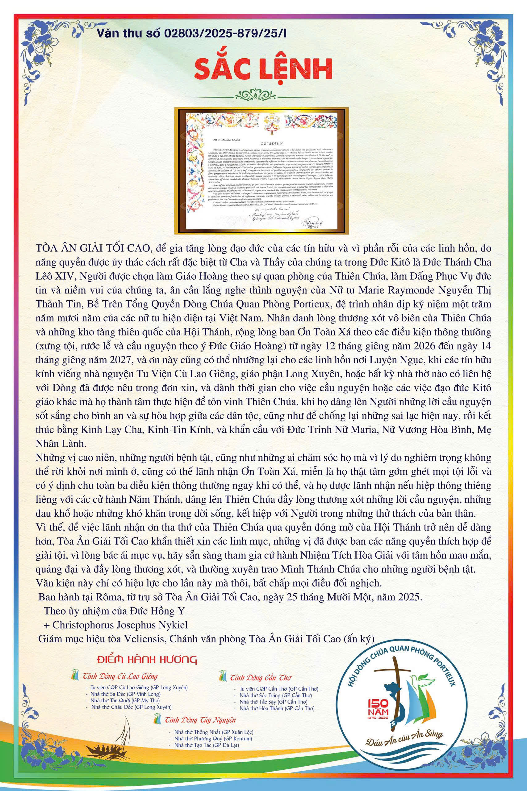 Nhân dịp kỷ niệm 150 năm Dòng Chúa Quan Phòng hiện diện tại Việt Nam, và chiếu theo lòng thương xót vô biên của Thiên Chúa cùng những kho tàng ân sủng thiêng liêng của Hội Thánh, Tòa Ân Giải Tối Cao ban Ơn Toàn Xá với các điều kiện thông thường (xưng tội, rước lễ và cầu nguyện theo ý Đức Giáo Hoàng) trong thời gian từ ngày 12 tháng Giêng năm 2026 đến ngày 14 tháng Giêng năm 2027.