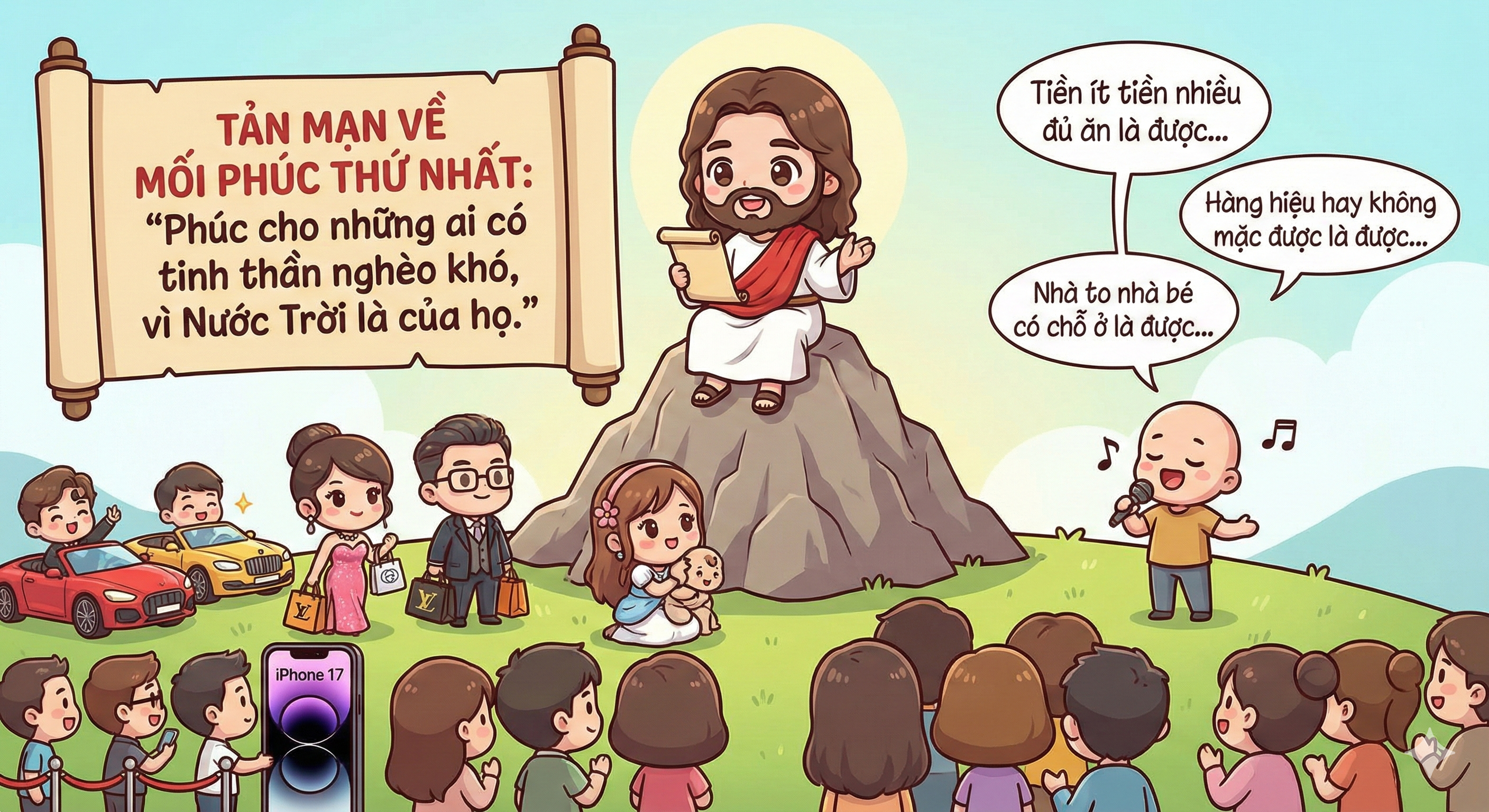 Lời bài hát xem ra hơi “cà rởn” nhưng khiến chúng ta phải suy nghĩ về mối phúc thứ nhất mà Đức Giêsu nói đến. Khi đọc đoạn Phúc Âm này có nhiều người đặt câu hỏi: chẳng lẽ Đức Giêsu cổ xúy cho cái nghèo và người giàu thì không có phúc hay sao? Thưa không, điều mà Đức Giêsu muốn nhắm tới đó là “tinh thần nghèo”. Ngày nay, người ta đánh giá người khác dựa trên xe sang, hàng hiệu, số dư trong tài khoản và những tiện nghi mà cuộc sống hiện đại mang đến. Khi “trái táo” Iphone 17 vừa ra mắt, không biết bao người xếp hàng chờ để sở hữu cho bằng được để khoe mẽ với bạn bè. Thật ra, những chiếc smartphone thời nay có rất nhiếu chức năng. Nhưng thực ra chúng ta sử dụng được bao nhiêu chức năng? Chúng ta mua một chiếc laptop vài chục triệu, nhưng liệu có đủ trình độ để khai thác và sử dụng hết các chức năng của nó không? Nhiều người thích mua xe máy có động cơ rất mạnh, nhưng trên thực tế có ai chạy hết tốc độ của chiếc xe máy chưa? Nhiều người, trong đó có lẽ có chúng ta nữa, đi siêu thị hay sắm đồ online chỉ mua cho đã tay, nhưng chắc về nhà có sử dụng tới không hay lại xếp xó và “lãng quên”? Hưởng thụ là nhu cầu của con người của mọi thời đại, tuy nhiên nên nhớ: chỉ cần đủ, không cần nhiều, không cần dư. Chính vì thế mà nhà thơ Nguyễn Công Trứ có viết : “Tri túc tiện túc, đãi túc hà thời túc” nghĩa là biết đủ thì đủ, chờ cho đủ (theo ý muốn của mình) thì tới bao giờ mới đủ !